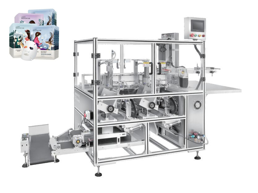โหลดแผ่นมาส์กบนสายพานลำเลียงทีละตัว→เครื่องจะพับอัตโนมัติและใส่ลงในถุงที่ทำไว้ล่วงหน้า→ส่งออกโดยสายพาน.
